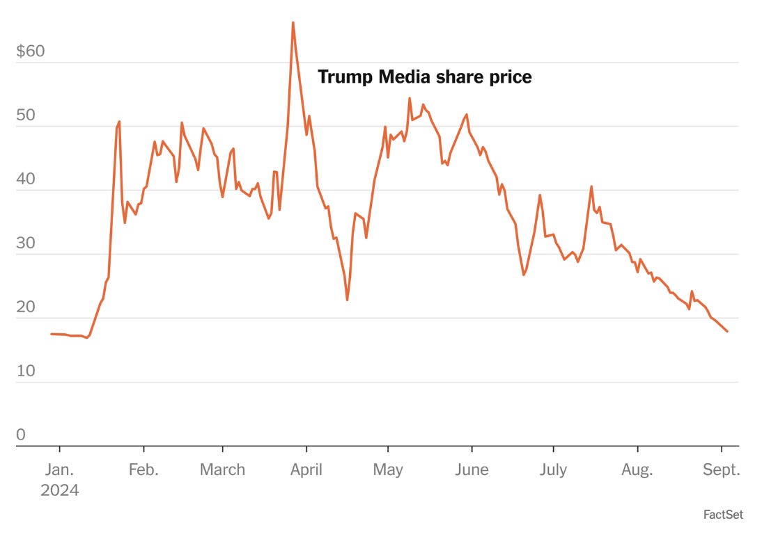 This means that if he fares poorly in his debate against Kamala Harris next week, the stock’s value may fall even further before Trump can sell shares. Sad!