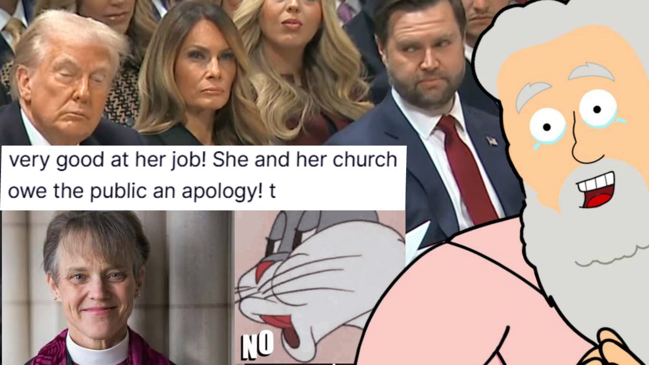 Yesterday, we witnessed Bishop Mariann Budde stand firmly against Donold’s fragile ego. After calling out his blatant hypocrisy in her powerful sermon, Donold demanded an apology, like the whiny, snotty little baby he is.