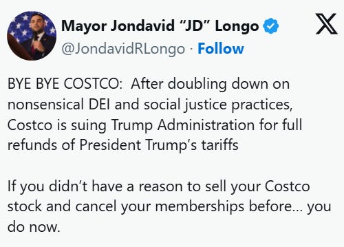 First up is the mayor of Slippery Rock Borough in Pennsylvania JD Longo, who decided to scream “BYE BYE COSTCO” because the company dared to follow DEI practices and also dared to challenge Trump’s illegal tariffs. A true warrior, bravely standing up to a grocery store.