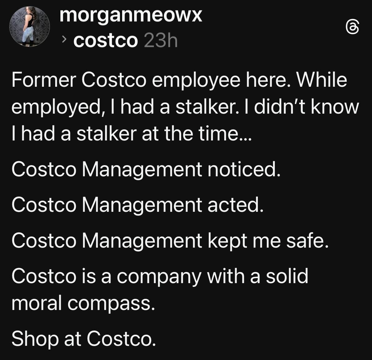 This is what I mean when I say character reveals itself in the storm. Costco protected their worker from a stalker without hesitation.