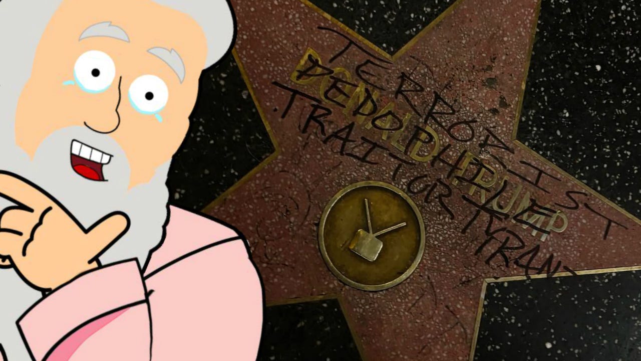 Bless whoever improved Donald’s Trump’s Hollywood star again, this time by writing “Terrorist Pedophile Traitor Tyrant” on it. SMITE!