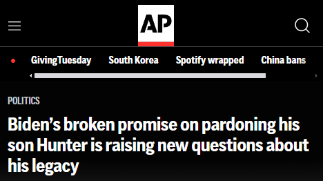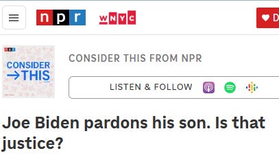 While we’re on the subject of corporate media coverage, it will shock no one that to learn that yesterday, the NY Times ran SIX stories on Joe Biden pardoning his son…and only ONE on Trump promising to weaponize the FBI to go after anyone he considers his political enemy, such as yours truly.