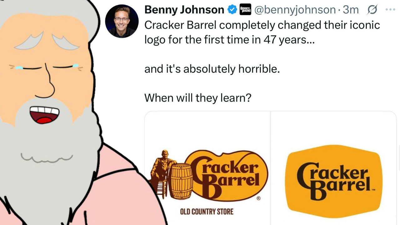 NAY! It’s the Cracker Barrel logo change. Buckle up, humans! These fragile crackers are crumbling.