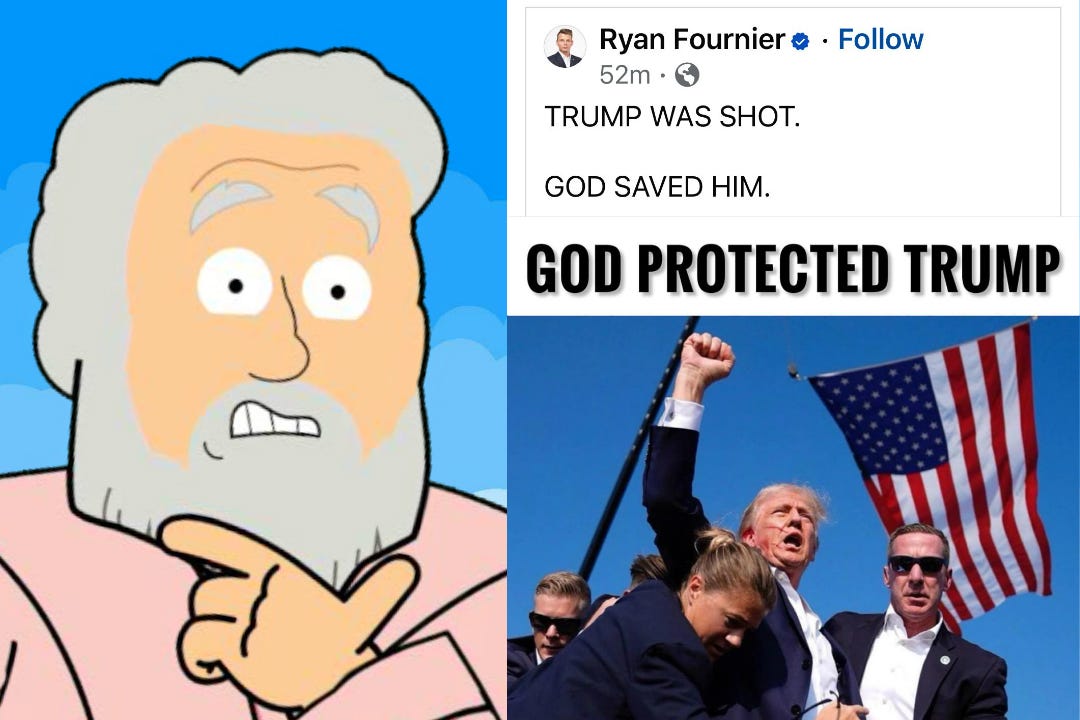 Like all of you, I am reeling from watching former President Donald Trump almost get assassinated today. I was on the toilet at the time, racing to finish up my holy shit, just so I could catch the coverage on MSNBC. Jesus was already there, crying his eyes out. So, let me be clear: I have an alibi! I was at home, with Jesus, in the loo. I a…