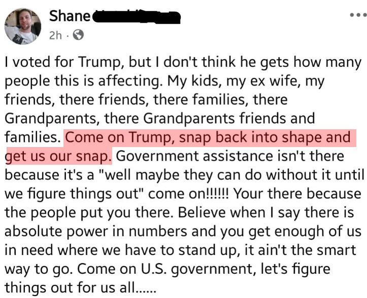“Come on Trump, snap back into shape and get us our SNAP,” one rube wrote.