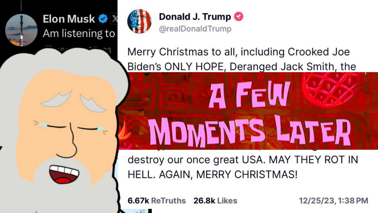 While most Americans celebrated Christmas yesterday with their loved ones, Elon Musk and Donald Trump couldn’t hide their misery, loneliness and rage. Both took to social media to express their pain. I present it now to you, for your enjoyment. Let us begin.