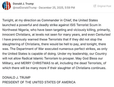Then on Christmas Day, he announced “powerful and deadly strikes” on “ISIS Terrorist Scum” in Nigeria, bragged that there would be “hell to pay,” and actually wished a “MERRY CHRISTMAS” to the dead terrorists.