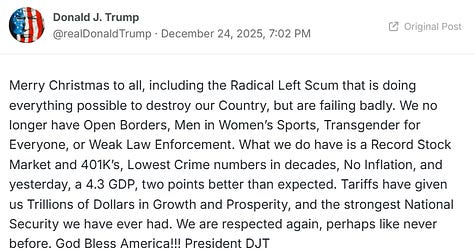 On Christmas Eve, his big ugh holiday message to the nation was, and I quote, “Merry Christmas to all, including the Radical Left Scum that is doing everything possible to destroy our Country.”
