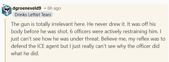 Maybe that’s because the video is extremely clear. ICE tackled him to the ground. They took his gun. And then they opened fire like the masked fascist death squad they are. And afterward they cracked jokes.