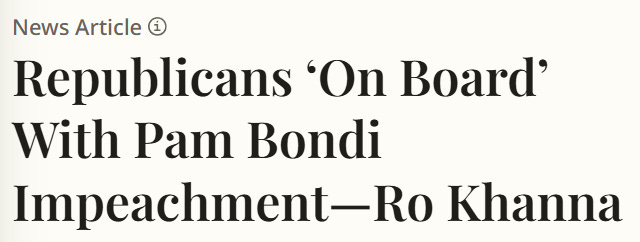 Now Ro Khanna is saying that Republicans are on board with holding Bondi in contempt and potentially impeaching her, and that Thomas Massie will lead the effort.
