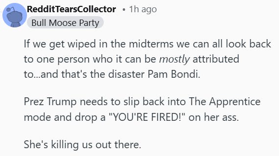 Most of them are still trying to pin it all on Bondi, not Trump, which is impressive mental gymnastics even by their standards. But the important part is this: they know it looks BAD. And they know theyâre going to get utterly destroyed in the midterms.