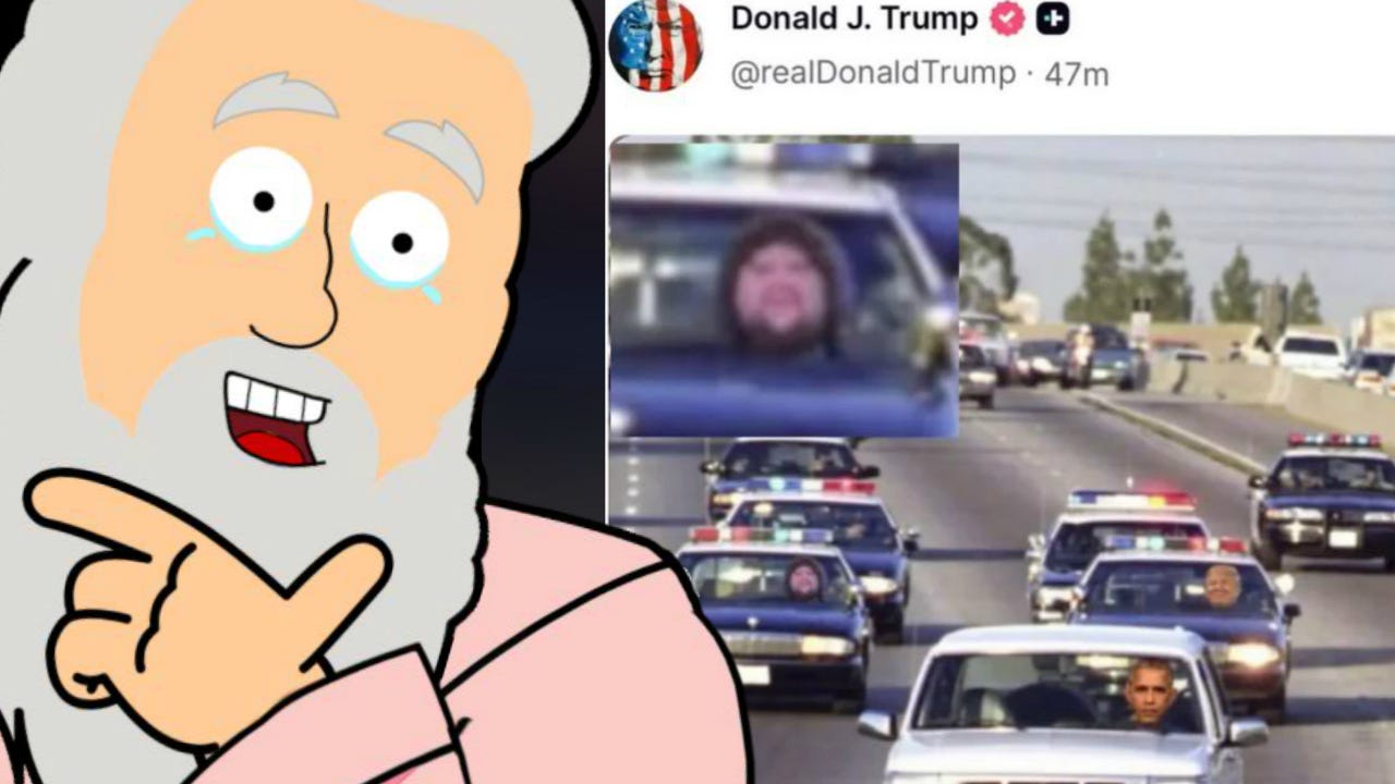 Lo, Donald “Epstein” Trump hath struck again. Yesterday, he posted a meme of himself chasing Obama (in a white Ford Bronco) down a freeway. Only one problem though. He included a ‘Fat JD Vance’ meme. Some people wondered if this signified a rift. Others suggested it was an accident and that Trump is an impulsive moron.