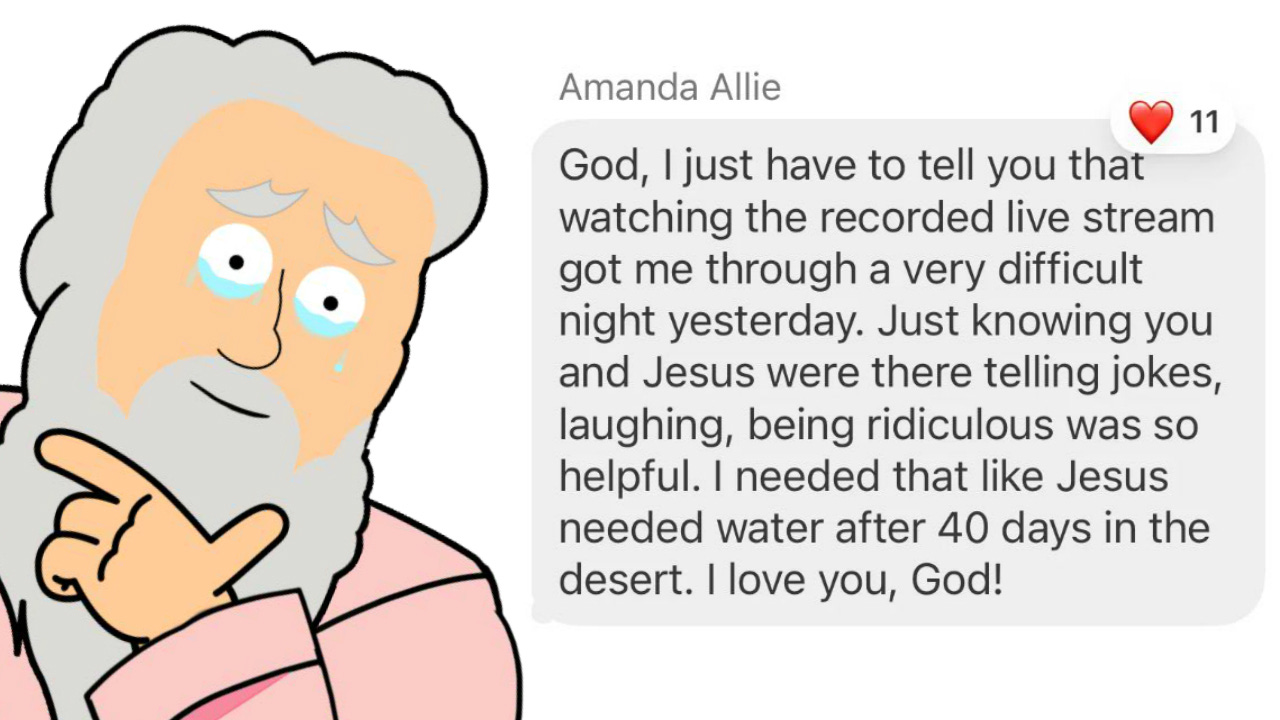 “God, I have to tell you that watching the recorded live stream got me through a very difficult night yesterday. I needed you and the laughter and jokes so much. I watched most of the streams and finally fell asleep at 5am. Thank you for being here for all of us. Please keep posting the recordings at night. I needed it so much and I know others do too.”