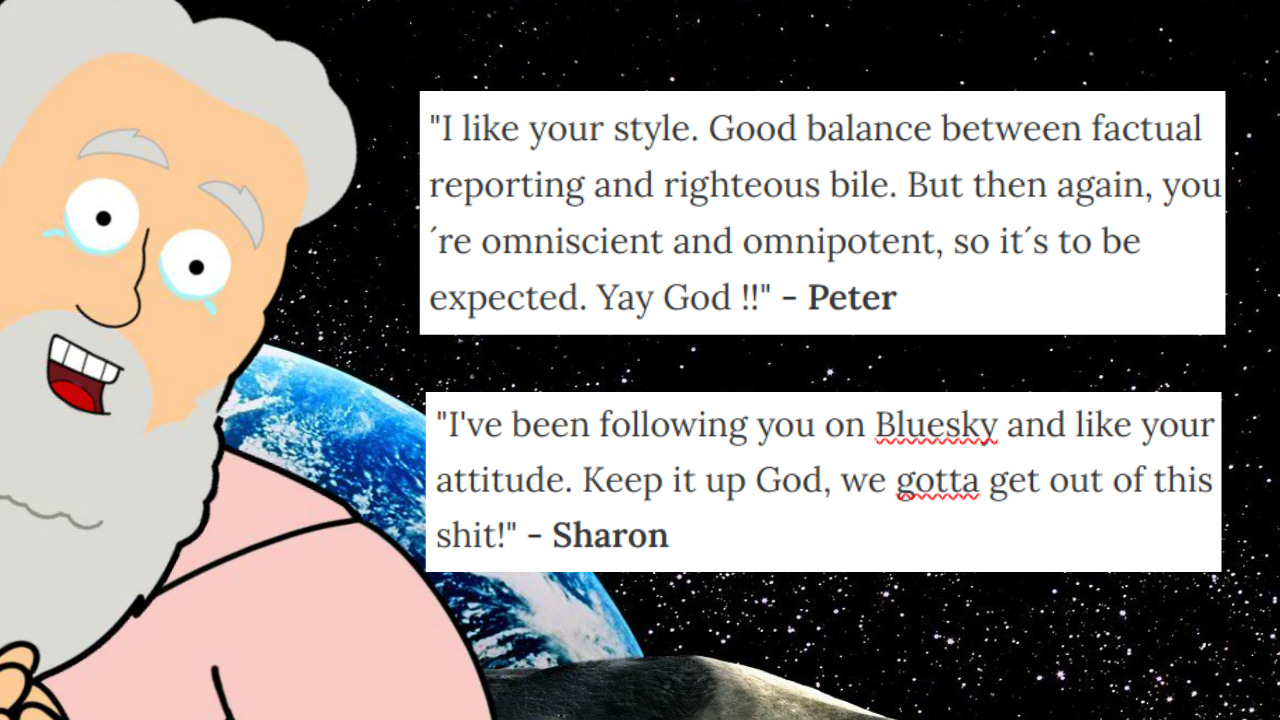God is taking this lazy Sunday off from laughing at the train-wreck clown-show that is President Musk and his lackey, Donold, to focus on something better—you.